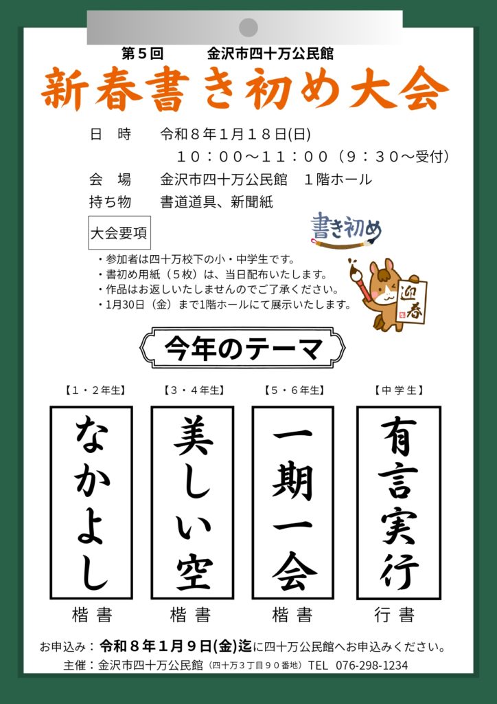 TOPNews 第5回 書初め大会 2026.01.09 令和8年1月18日(日)10時~公民館ホールにて書初め大会を開催いたします。 詳細は下記のチラシをご覧ください。 参加賞、入賞賞品をご用意しておりますので、ぜひご参加ください。 締め切りは1月9日(金)までとなっております。