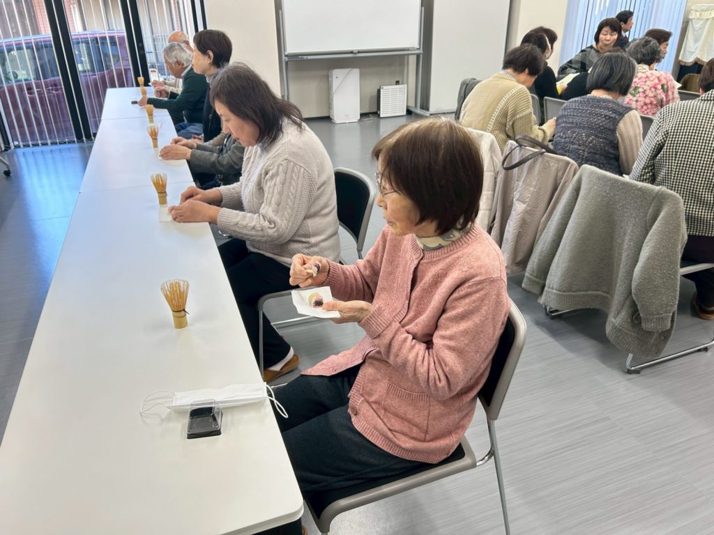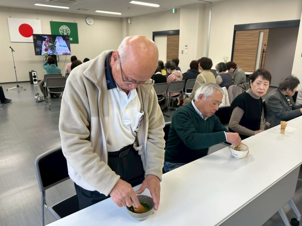 美味しい上生菓子を食べてからお抹茶をいただきます。お茶を点てる体験は皆さん楽しんでおられました。順番を待っている間は、今年度の活動写真をモニターで見ていただきながら振り返ってもらいました。